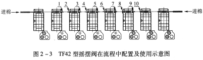 在圖2—3中,1~10各表示一只TF42型搖擺閥及安裝位置,當1號和2號處于關閉狀態,其余處于打開狀態時,可實現梳棉機喂棉箱按2:6進行配棉;當3號和4號處于關閉狀態,其余處于打開狀態時,可實現梳棉機喂棉箱按3:5進行配棉;當5號和6號處于關閉狀態,其余處于打開狀態時,可實現梳棉機喂棉箱按4:4進行配棉;當7號和8號處于關閉狀態,其余處于打開狀態時,可實現梳棉機喂棉箱按5:3進行配棉(圖2—3所示即為5:3配棉);當9號和10號處于關閉狀態,其余處于打開狀態時,可實現梳棉機喂棉箱按6:2進行配棉。一般情況下,TF42型搖擺閥須成對配置,以免造成管道堵塞。