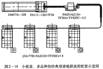 FA006D—172型往復抓棉機(附TF27型橋式磁鐵)→AMP2000型金屬火星探除器→TF45A型重物分離器→FA05lA(7.5)型凝棉器+TF2407A型支架裝置+FA103A型雙軸流開棉機→FA028C~120型多倉混棉機+FAl09A-120型三輥筒清棉機(17F34型磁鐵裝置)→FAl5l型除微塵機→(FAl77B型喂棉箱+FA22lD型梳棉機+TF2511型圈條器)×(6~10)。