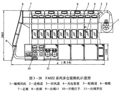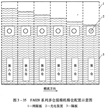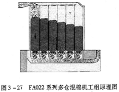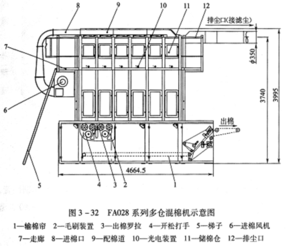 FA028系列多倉(cāng)混棉機(jī)由機(jī)架、出棉羅拉、開棉打手、毛刷裝置、輸棉簾、棉倉(cāng)、配棉道、氣動(dòng)控制裝置和電氣控制系統(tǒng)等組成(圖3—32)。