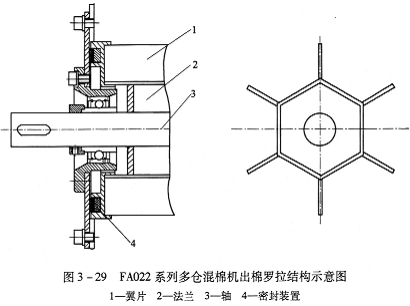 (2)出棉羅拉:每個(gè)棉倉(cāng)下部裝有一對(duì)出棉羅拉,出棉羅拉由法蘭、翼片、軸和密封裝置組成,翼片、法蘭、軸焊接成一個(gè)整體(與FA022系列多倉(cāng)混棉機(jī)的出棉羅拉結(jié)構(gòu)相同,參見圖3—29),十二個(gè)出棉羅拉由一個(gè)1.5kW的變頻減速電動(dòng)機(jī)傳動(dòng)。