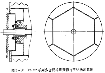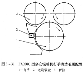 (4)FA028C型多倉(cāng)混棉機(jī)的開松打手周圍裝有清潔毛刷(圖3—31),專門用于清除打手表面勾掛的纖維,防止纏繞打手,影響開松效果使棉結(jié)增加。該機(jī)型不僅適于紡細(xì)絨棉,也適于紡長(zhǎng)絨棉及化學(xué)纖維等。