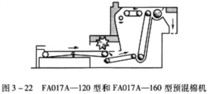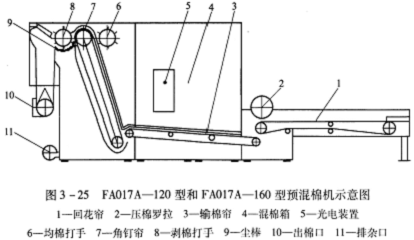 (6)回花簾:FA017A—120型、FA017A-160型、FA017B-120型和FA017B—160型預(yù)混棉機(jī)還設(shè)有回花簾,位于機(jī)器的后部,由橡膠簾子和壓棉輥組成,用于人工喂棉。
