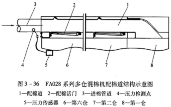 (7)配棉道:配棉道位于機(jī)頂,用于輸送原料至各棉倉(cāng),其結(jié)構(gòu)如圖3—36所示。任一棉倉(cāng)上部的配棉活門開啟后,配棉道與此棉倉(cāng)形成進(jìn)棉通道,可向此棉倉(cāng)喂棉。配棉道進(jìn)棉口處有一通氣孔,此通氣孔通過(guò)氣管與壓力傳感器相連以在線檢測(cè)此棉倉(cāng)壓力,隨著此棉倉(cāng)棉量的增加,此棉倉(cāng)前后網(wǎng)眼板上的網(wǎng)眼通氣孔會(huì)逐漸被堵塞而引起此棉倉(cāng)內(nèi)壓力上升,當(dāng)在線檢測(cè)出的此棉倉(cāng)壓力達(dá)到設(shè)定壓力時(shí),此棉倉(cāng)的配棉活門關(guān)閉,此棉倉(cāng)喂?jié)M棉,同時(shí)后一個(gè)棉倉(cāng)上部的配棉活門開啟,向后一個(gè)棉倉(cāng)喂棉。此過(guò)程重復(fù)至六個(gè)棉倉(cāng)喂?jié)M棉,一個(gè)喂棉過(guò)程完成。設(shè)定壓力由使用廠根據(jù)實(shí)際需要在操作屏上設(shè)定。配棉道底部從第二倉(cāng)向后各倉(cāng)上的配棉活門都由氣缸拉桿推動(dòng),配棉活門的開、閉動(dòng)作隨棉倉(cāng)壓力的變化由PLC控制。