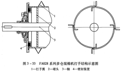 (3)開棉打手:開棉打手位于每對(duì)出棉羅拉的下部中央,每個(gè)打手由打手翼、軸、堵頭和密封裝置組成(圖3—33),前端為鋸齒形的打手翼、堵頭、軸焊接成一個(gè)整體。六個(gè)打手由一個(gè)5.5kW的電動(dòng)機(jī)傳動(dòng),第一和第六打手非傳動(dòng)端的軸頭處設(shè)有轉(zhuǎn)速監(jiān)測(cè)裝置,當(dāng)打手轉(zhuǎn)速低于設(shè)定工藝轉(zhuǎn)速時(shí),出棉羅拉停止給棉,顯示面板出現(xiàn)報(bào)警。