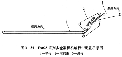 (5)輸棉簾:輸棉簾由平簾、斜簾、壓棉簾組成,如圖3—34所示。FA028型的平簾、斜簾、壓棉簾均由與其配套使用的清棉機(jī)的給棉電動(dòng)機(jī)傳動(dòng);FA028B型和FA028C型的平簾由平簾電動(dòng)機(jī)單獨(dú)傳動(dòng),斜簾、壓棉簾由與其配套使用的清棉機(jī)的給棉電動(dòng)機(jī)傳動(dòng)。輸棉簾的速度隨與其配套使用的清棉機(jī)給棉速度變化而變化。