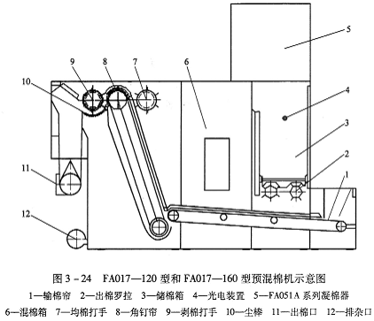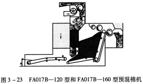 (1)FA017—120型和FA017—160型與FA051A系列凝棉器配套使用,利用凝棉器進(jìn)行喂棉(圖3—21);FA017A一120型和:FA017A~160型有加長(zhǎng)混棉簾子,采用手動(dòng)喂棉方式(圖3—22);FA017B~120型和FA017B-160型既可與FA051A系列凝棉器配套使用,利用凝棉器進(jìn)行喂棉,又具有加長(zhǎng)混棉簾子,也可采用手動(dòng)喂棉方式(圖3—23)。
