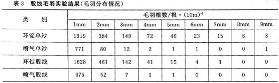 測試儀器為YGl72型毛羽儀。測試參數:速度30m/min,片段長度10m,溫度20℃,相對濕度65%。該測試對純棉的噴氣單紗、環錠單紗、噴氣股線(T=600捻/m)、環錠股線(T=600捻/m)的各種長度的毛羽進行了分類測度。