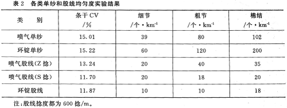 在這次試驗中,合股加捻對環錠紗的貢獻(K=PK/2P0),即骰線強力PK與組成股線韻單紗強辦Po之和的比值)為K=1.78,而對噴氣股線強力的貢獻則為K=2.68。這說明,合股加捻對于提高噴氣紡紗線的強力的作用是非常顯著的,對于縮短噴氣紗與環錠紗之間強力的差距是非常有效的方法。在本實驗中,由于噴氣紡紗樣機的牽伸裝置系由常規環錠搖架替代、且溫濕度等無法進行控制,所以受條件限制,噴氣單紗的強力較低,僅為環錠單紗強力的45%,同時,與商業化的噴氣紡紗機相比,成紗的條干均勻度也尚未達到很理想的程度。然而,噴氣股線的強力卻達到環錠股線的66%。如果噴氣單紗的強力能再有所改善,股線的強力也會有所增加的,必將