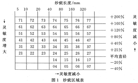 圖1為清紗器的紗疵界限參數表。方框中的數值表示紗疵的區域,例如53號紗疵區域表示紗疵的長度為20mm040mm,紗疵的直徑要比平均直徑粗80%~120%。在清紗器上輸入紗疵區域參數后,對于粗節來說,該區域右邊及上邊等紗疵區域將被清除,而對于細節來講,該區域的下邊及右邊將被清除。