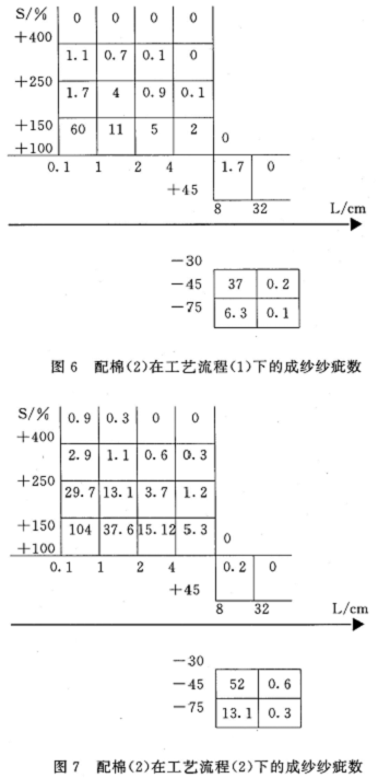 圖6、圖7所示的紗疵分布表明,在原棉配棉較差的條件下,工藝流程越短,轉杯紡紗產生的紗疵越多。