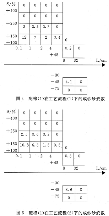 配棉(1)采用(1)、(2)種工藝流程的成紗紗疵情況分別見圖4、圖5。