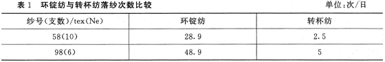 (1)紡制粗號(hào)紗時(shí),環(huán)錠紡因紗錠卷裝小,落紗次數(shù)頻繁(見表1),實(shí)際產(chǎn)量與理論產(chǎn)量有較大差距。不但增加本工序用工,還增加了絡(luò)筒用工。因而轉(zhuǎn)杯紡生產(chǎn)率和收益費(fèi)用比與環(huán)錠紡拉大了倍數(shù)。
