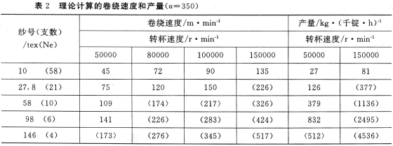 從理論上講,根據(jù)(5)式,轉(zhuǎn)杯紡的產(chǎn)量與轉(zhuǎn)杯的轉(zhuǎn)速成正比,隨著轉(zhuǎn)杯轉(zhuǎn)速的提高,粗號(hào)紗的產(chǎn)量也可成比例地提高。假如說紡98tex紗時(shí),轉(zhuǎn)杯轉(zhuǎn)速從5萬r/min提高到15萬r/min,產(chǎn)量就可以提高3倍。但實(shí)際上轉(zhuǎn)杯紡的產(chǎn)量還要受到紡紗機(jī)引紗速度、分梳棍針面負(fù)荷和輸纖通道截面及氣流輸送分離纖維能力等因素的限制。表2是根據(jù)(4)和(5)式理論計(jì)算出的紗的卷繞速度和產(chǎn)量(取a=350)。從表2中可以看出,紡10tex紗轉(zhuǎn)杯轉(zhuǎn)速為5萬r/min,其引紗速度為45m/min,產(chǎn)量27kg/千錠·h