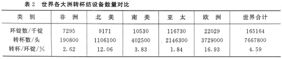 世界各大洲轉杯紡設備數量對比見表2。從表2可知,今后世界上轉杯紡紗還會有較大發展的是非洲、亞太地區和南美。