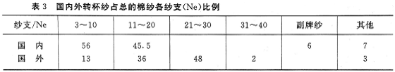 但從表3可以看出,國內29tex以上(20Ne以下)的粗號轉杯純棉紗所占總的棉紗比例已相當高,而且不可能29tex