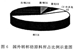 Autocoro型機所紡原料的比例純棉為55%(見圖6)。而我國絕大多數比例是紡棉,但是從原料的資源來看,我國的苧麻、黃麻及柚絲、兔毛等資源十分豐富,在世界上產量占優勢。因此,我國的轉杯紡紗應積極開發原料和降低紗號,來擴大其應用范圍。