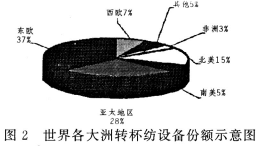 目前,各大洲擁有轉杯紡紗設備的份額分布見圖2(1998年底統計)。