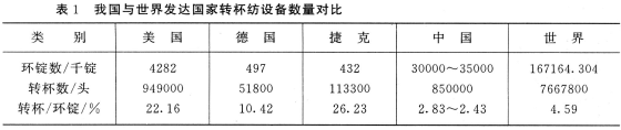 從ITMF(國際纖維制品制造業者聯合會)每年對世界上115個國家擁有的短纖維紡織設備的安裝及運轉狀況的統計結果(到1999年底)[2],筆者選擇了幾個發達國家、我國及世界總的環錠紡紗總數與轉杯紡紗頭數的百分比并列于表1,由此可以說明一些問題