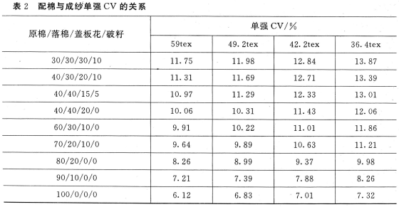為了進一步探討單強cV值與一些原料、設備、工藝的聯系,首先我們改變轉杯紡的原料成分來紡59tex、49.2tex、42.2tex、36.