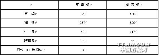 表1不同軋花方法生產(chǎn)的原棉及各工序棉結(jié)含量對(duì)比(粒/克)
