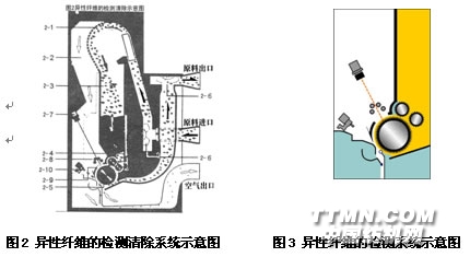 2這種清除異纖的動(dòng)作是與纖維束被分離的程度有關(guān),檢測(cè)出異纖的動(dòng)作有一定的間隔時(shí)間,異纖檢測(cè)的訊號(hào)經(jīng)由電子計(jì)算機(jī)通知噴嘴,同步動(dòng)作。將排出的異纖等雜物,經(jīng)過(guò)濾器過(guò)濾,并配有凝棉箱,用于搜集被排出的異纖。