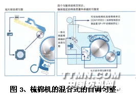 二、德國特呂茨勒TC5-1梳機還裝有短片段自調勻整系統,使該系統可作用在長度小于1米的棉條上,極大的改善了棉條的均勻度。棉筵厚度被簡便喂入裝置EASYFEED連續檢測,梳棉機可根據所測的資料計算出對喂棉羅拉速度的調節
