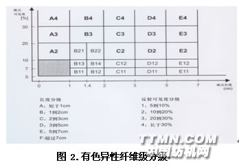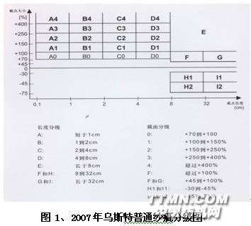 2007年烏斯特紗疵分級圖包括一般紗疵分級圖及有色異性纖維分級圖兩種,是在2005年的基礎上發展的,主要增加了有色異性纖維分級圖,也擴大了對一般紗疵分級的分級的范圍