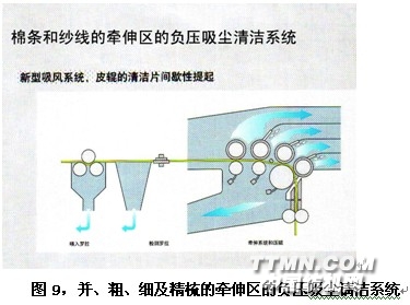 一、現代化的紡紗設備都十分注意負壓吸塵的系統的設置,像梳棉機的負壓吸塵點已擴大到12個或更多,在蓋板區還設有負壓吸塵罩板。 二、現代高擋轉杯紡紗機選用的紡紗箱都具有很好的清出雜質的性能,以保證紡紗質量及適應高速及紡較高紗支數的要求。 三、新的棉條的牽伸系統大都配有負壓吸塵清潔系統代替了以往的上下絨輥絨布,提高了棉條及紗線的進凈化程度,減少了偶發性疵點的發生數量及頻率見圖9