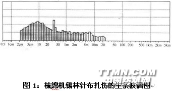 在梳棉機上出現周期性的不勻,每分鐘會產生n個周期性的疵點,通過測算及工藝檢查,可發現梳棉機生條的每分鐘的輸出速度為up(m/min),在這個輸出長里會有n個周期性的疵點出現,其周期性疵點的波長為L=Up/n或n=Up/L.假如梳棉機的引出速度是160米/分,波譜圖上有37.5厘米左右的機械波疵點。經公式n=Up/L計算,n=160×100/37.5=427(次),基本與梳棉機錫林速度427轉/分一致,經查找梳棉機錫林針布有一處明顯的損傷。(如圖1)