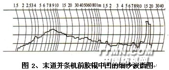 例⑴、末道并條機前膠輥中凹的細紗波譜圖(見圖2),