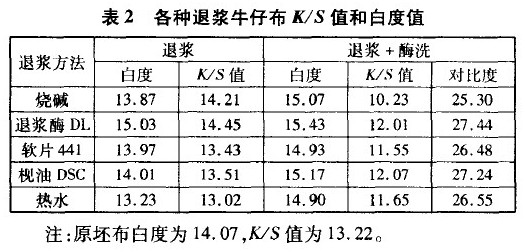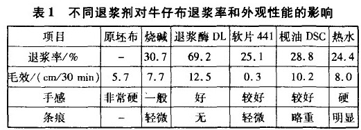 分別采用燒堿、退漿酶、軟片、枧油和熱水對牛仔布進行退漿處理,效果見表1