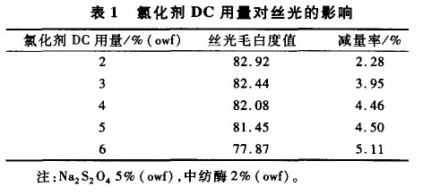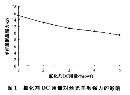 由表1及圖1可知,氯化劑DC用量大,絲光毛白度、強力都降低,5% 一6% (owf)的用量足以滿足絲光要求。