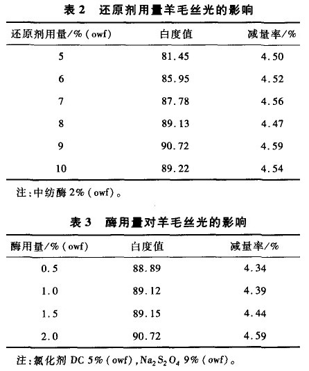 采用氯化劑DC用量5%(owf),不同還原劑用量時,按上述步驟處理纖維,結果見表2。酶用量對羊毛絲光的影響見表3。