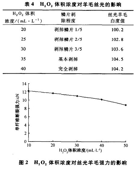 中紡酶CTB—B 0.5%(owf),按上述步驟處理,H2O2 體積濃度對羊毛絲光的影響見表4及圖2。