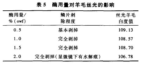 取H2O2 35 mL/L,按上述步驟處理,不同酶用量對羊毛絲光的影響見表5。