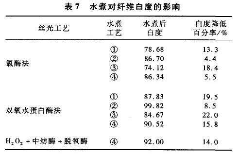 雙氧水蛋白酶法絲光毛主要工藝參數:30% 的 H 0 35 mL/L,中紡酶0.5% (owf),白度109.13。對以上2種絲光羊毛,分別采用以下4種水煮工藝進行水煮:① 85℃ 水,