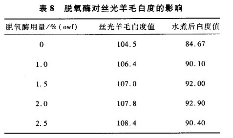 由表6及圖3可知,脫氧酶是一種氧化還原酶,在分解H202的同時,提高絲光羊毛的白度,但是對強力稍有降低,其用量1.5%(owf)較為理想。