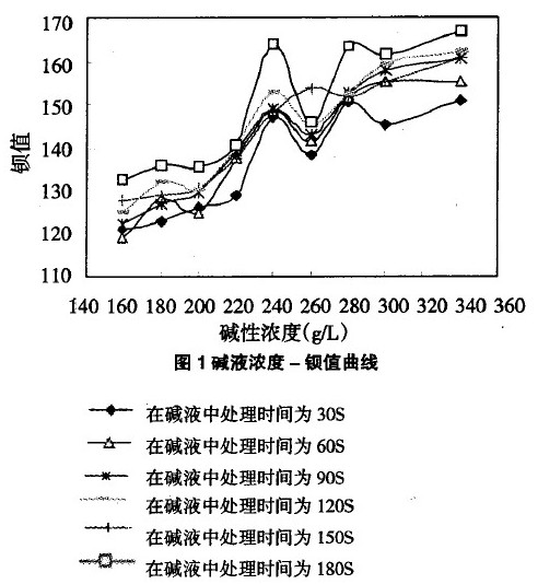 做時間為30、6O、90、120、150、180(s)、堿液濃度為160、180、200、220、240、260、280、300、340(g/L)的交叉試驗。