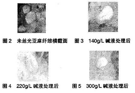 討論:隨著堿液濃度的增大,亞麻纖維迅速溶脹,橫截面