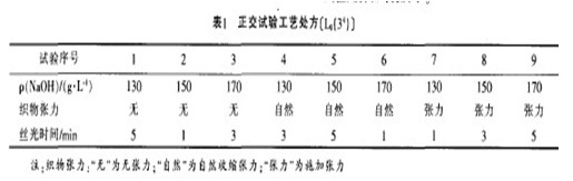 亞麻織物的絲光時間指在亞麻織物小樣進人堿液開始到沖洗為止。從工藝因素篩選試驗可見.在試驗范圍(1~5 min)內對強力變化、吸附性能提高影響不大.但長時間的加工織物強力也有降低的
