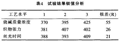 1.3.1.1 影響亞麻織物絲光強力的主要因素通過極差分析.影響亞麻織物絲光強力的因素順序是:絲光張力>燒堿質量濃度>絲光時間(極差數值分別為:4.9、4.1、2.8)。
