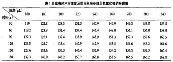 亞麻布經(jīng)過(guò)一定濃度的氫氧化鈉溶液處理后,對(duì)染料、氫氧化鋇的吸附值(鋇值)均發(fā)生了相應(yīng)的變化,我們可以利用鋇值來(lái)反映亞麻布對(duì)染料吸附性能的變化,以達(dá)到充分合理地利用染料及降低生產(chǎn)成本的目的。下面的絲光試驗(yàn)中,我們用氫氧化鋇的吸附值(鋇值)來(lái)考核亞麻布的絲光效果,同時(shí)也要考慮亞麻布的強(qiáng)力損失。