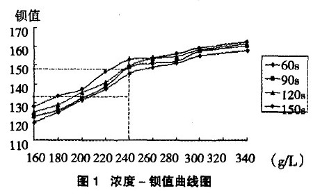 由于數(shù)據(jù)比較多,所以我們僅以時(shí)間(s)60、 90、120、150為例,繪制濃度一鋇值曲線圖,再以氫氧化鈉濃度(d/l)180、200、220、240、280為例,繪制時(shí)間一鋇值曲線圖,以此來(lái)分析工藝參數(shù)氫氧化鈉濃度、絲光時(shí)間與鋇值的關(guān)系。圖1是濃度一鋇值曲線圖,圖2是時(shí)間一鋇值曲線圖。
