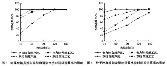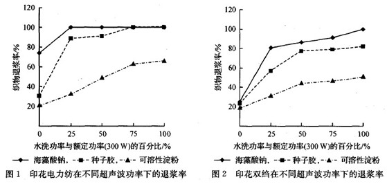 印花雙縐退漿水洗時,以海藻酸鈉作糊料的印花織物若要達到100% 的退漿率,常規水洗需要120 s,超聲波水洗只需60 S,時間縮短了一半。以種子膠作糊料的印花織物,超聲波水洗120 S退漿率達到100 %,比常規水洗省時至少1/3。以可溶性淀粉作糊料的印花織物,超聲波水洗180 S退漿率達到100 %,是此時常規水洗退漿率的2倍。