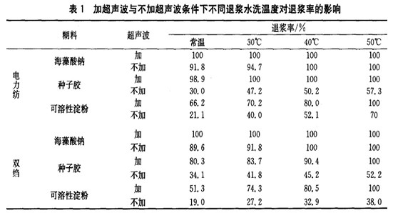 從表l可以看出,以海藻酸鈉作糊料的印花電力紡,退漿率若要達到100% ,在超聲波條件下常溫即可,而常規水洗則需要升溫到4O℃;以種子膠作糊料的印花電力紡在超聲波30℃條件下退漿率可達100 %,而常規水洗升溫到5O℃退漿率仍為57.3 ;以可溶性淀粉作糊料的印花電力紡,在超聲波50℃條件下退漿率可達100 %,常規水洗50℃退漿率僅70% (在超聲波30℃條件下即可達到退漿率7O% )。印花雙縐退漿水洗與印花電力紡情況類似,在此不作重復分析。