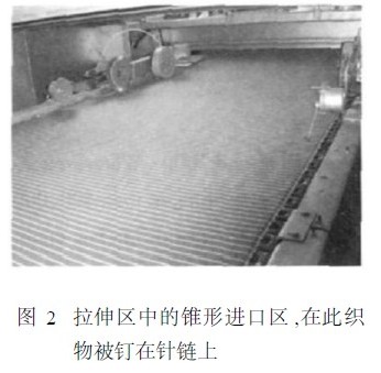 拉伸區是Ben2Dimensa 設備的心臟部分。在此,預先設定和儲存了被整理織物的門幅和重量參數。在剝邊器的幫助下,對針織物剝邊,并且通過超喂導輥將織物釘在垂直針鏈上(圖2) 。拉伸區由錐形區和平行區組成。在錐形區, 織物被拉伸,因此其門幅要超出最終的門幅。在平行區,通過噴熱的弱堿液來穩定織物尺寸。根據張力鏈條的速度,拉伸區入口可任意改變。當處理針織物時,為了獲得最大可能的尺寸穩定性和最小剩余收縮率,機器通常超喂運行。針織物可吸收高達30%的超喂。拉伸區也為糾正邊緣增厚提供了唯一一次機會。在絲光過程中,邊緣增厚是由于織物邊緣比在中間部分更易引發門幅收縮。這是因為用燒堿浸漬后棉纖維膨脹, 立即發生門幅收縮的結果。邊緣增厚改變了線圈結構, 引起色變 (通常變淺) 。在過去,考慮到這個原因更高剪裁損耗也是可以接受的,然而,如今此損耗量已大大降低。貝寧格已經開發了一種放在張力鏈上的專用邊緣拉伸器,邊緣出現的任何變厚都可被糾正,隨后再通過噴射稀燒堿來固定。這尤其影響到高度橫彈織物,如波