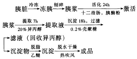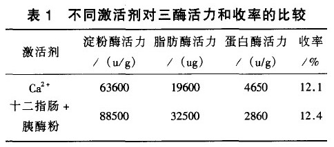 目前,國內外一般采用加入1—1.5倍的25%乙醇,用1:1鹽酸調節pH值5—6,加入Ca2+ 激活劑對胰漿激活。此法較注重蛋白酶的活力的提高,而疏忽了對脂肪酶和淀粉酶的活性保護,尤其對脂肪酶破壞較大。因此,本法采用20% 的異丙醇來代替25% 乙醇,以減少對脂肪酶的破壞并在提取后回收異丙醇減少對環境的破壞;用十二指腸和胰酶粉作為激活劑,在