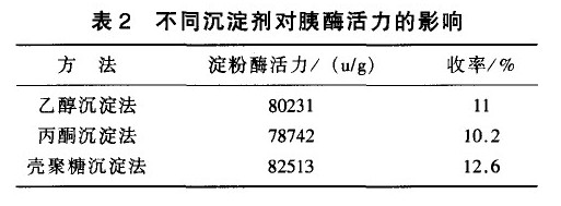 本工藝采用殼聚糖作為蛋白質沉淀劑來沉淀胰酶 ]。將活化胰液加入殼聚糖濃度為0.2%。并在 10%,pH=3.0的條件下靜置18h。在相同靜置時間和溫度條件下,和乙醇沉淀法及丙酮沉淀法相比較。結果見表2。