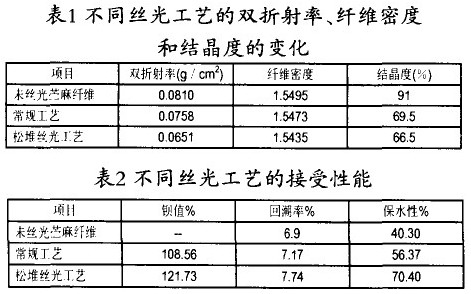由于苧麻纖維的結晶度、取向度都大大高于棉纖維而延伸度卻較低,其在燒堿溶液中的溶脹度也低于棉纖維,加上本身已有較好的光澤,在較大張力下以濃堿處理將大大降低苧麻纖維的活度,并影響手感,要解決這些問題除加強合理的退煮漂前處理工序外,還須改進絲光工藝和進一步處理好脫膠和研究纖維結構的改進及染料結構和色素的影響等。根據陶乃杰教授研究開發的松堆絲光工藝實踐,證實合理的絲光工藝為浸軋 150—160克/升燒堿、松堆5分鐘以上,延長纖維與燒堿的作用時間——擴幅——去堿,經生產實踐證實松堆絲光工藝完全可達到改善染色性能,提高得色深度和鮮艷度的要求。(可見表1、表2、表3)