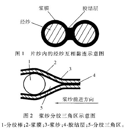 在經(jīng)紗上漿過程中,當(dāng)經(jīng)紗與漿液接觸后,就會吸附漿液。所吸附的漿液按照在經(jīng)紗上的位置可以分成兩部分:一部分漿液借助于壓漿輥的壓力和纖維之間孔隙的毛細(xì)管作用,浸透到經(jīng)紗的內(nèi)部,黏附于纖維之問的漿液經(jīng)烘干之后便在纖維之間形成黏合性的膠層,對纖維實(shí)施黏合,增大了經(jīng)紗的強(qiáng)度。另一部分漿液則會被覆在經(jīng)紗的表面,當(dāng)被烘干之后,便在經(jīng)紗表面形成漿膜。